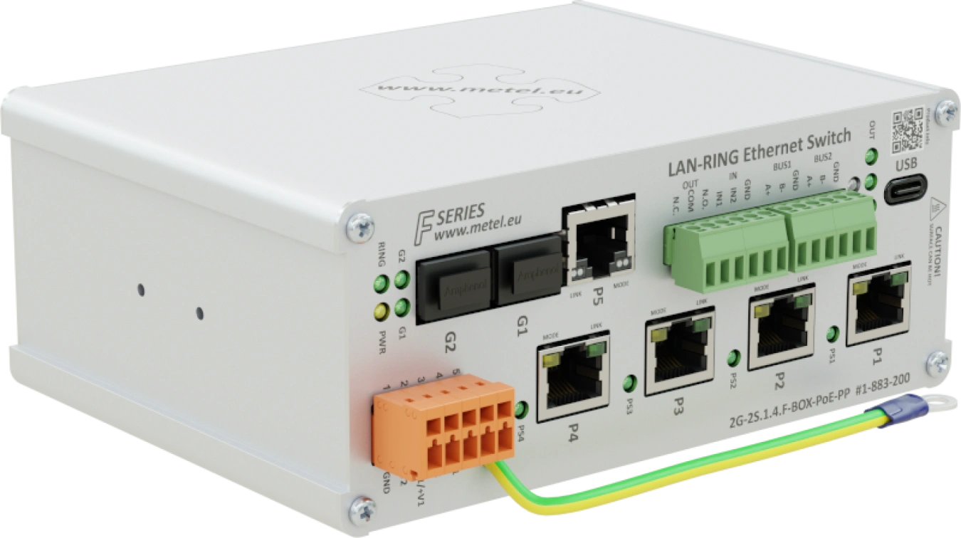Priemyselný switch pre RING topológiu s 2x SFP slot, 1x GE port, 4x Fast Ethernet port s PoE, podpora UPOE, POH, 802.3af/at/bt, max. 95W na port, maximálny celkový odber PoE na všetkých portoch je 170W, prepäťové ochrany FE portu 1000A, 2x DI s podporou vyváženej slučky, 1x programovateľný výstup NO/NC RELAY, 2x RS485 / 1x RS422 BUS (podpora modulu MODBUS, TCP server, Režim UDP), USB port pre lokálnu správu, redundantný vstup napájania, prepäťové ochrany na všetkých vstupy, EVENT MANAGEMENT: SMTP, TCP udalosti, ETH udalosti, HTTP klient (manažment kamery), 8x IPWatchdog, prevádzková teplota -40...+70°C, VLAN, QoS, IGMP, SNMPv2/v3, SNTP, inštalácia na byt povrch alebo DIN35, 12VDC/24VDC/48VDC/12VAC/24VAC/56VDC