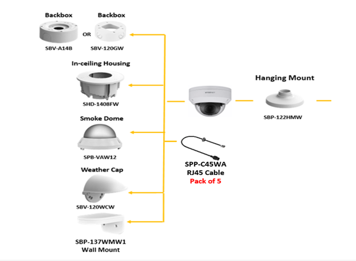 Vonkajšia vandalská kupolová kamera Wisenet série A4MP @ 30 FPS3 mm pevná ohnisková vzdialenosťWiseStreamIItrojitý kodek (H.265/H.264/MJPEG)120 dB WDRIR LED 20 m (65,62 stôp)deň a noc (ICR )FoV H: 98,3° / V: 54,2°virtuálna oblasť (vniknutie/vstup/výstup)virtuálna linka (prechod/smer)detekcia pohybutamperingpohľad na výškuSD kartaIP66IK10PoEbiela.