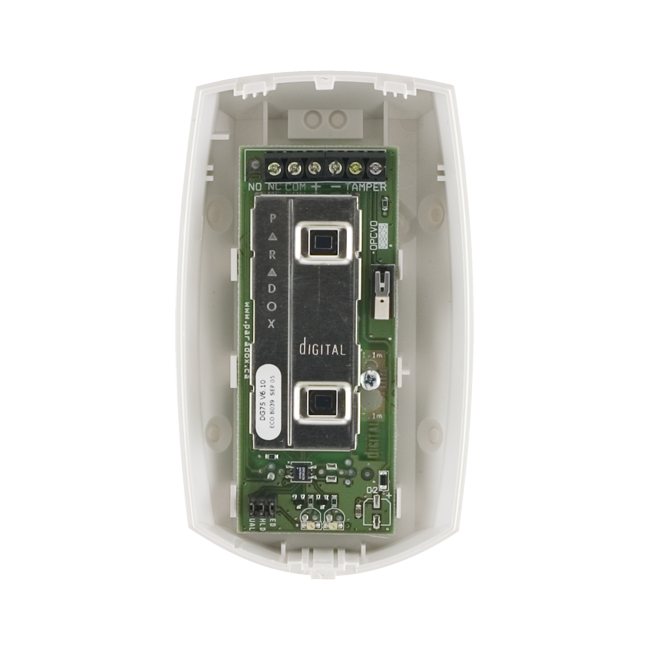 Pohybový detektor so štvornásobným prvkom. Tento senzor má patentovanú technológiu digitálneho spracovania. Princíp digitálnej technológie je založený na eliminácii analógových komponentov (zosilovačov) medzi senzorom a softwarom pre ďalšie digitálne spracovanie informácie. Vývojovými pracovníkmi firmy Paradox bolo nájdené riešenie pre priame privedenie nízkoúrovňového signálu priamo zo senzora do softwarovo riadeného obvodu pre detekciu. Okamžitý digitálny prevod signálu priamo zo senzora zabraňuje akýmkoľvek stratám, zmenám alebo skresleniu signálu, pri čom je garantované viac ako desaťnásobné vylepšenie rozkladu, dynamiky a pomeru signál / šum.Dômyselné riešenie software pre spracovanie signálu zvýrazňuje reálny pohyb a ignoruje falošn= poplachové signály.Vďaka svojmu výnimočného súboru vlastností sú digitálne detektory firmy PARADOX v popredí záujmu medzinárodných profesionálov v oblasti zabezpečenia.Vlastnosti Patentovaná technológia digitálneho zpracovani Patentovaná technológia automatického počítania impulzo Algoritmus pre štít s nastaviteľnou citlivosťo Kovový kryt pre odrušenie VF polí Vstavané relé Ochranný kontak Vysoko spoľahlivý detektor s najvyššou úrovňou zabezpečeni Dvojitá optika ( 2 protichodne zapojené senzory Imunita proti zvieratám, realizovaná opticko-digitálnym spracovaní Imúnny na zvierata do 40 k Dosah 11 x 11 m, uhol 90° Technické parametre Typ senzora: Duálna optika ( 2 dvojité protichodné elementárne senzory Geometria senzora: Obdĺžnikový Pokrytie: -90° (štandard) 11 m x 11 Imunita: Do 40 k Pacovná teplota: - 20 °C do + 50 ° Napájánie: 11 až 16 VD Prúdová spotreba: 15 mA maximu Odolnosť EMI/RFI: 10 V/m od 10 MHz do 1 GH šošovka: Druhá generácia Fresnelových šošoviek, LODIF Rýchlosť detekcie: Od 0,2 m do 3,5 m / sek Poplachový vstup: Druh A relé 100 mA/28Vdc, N.C. ( voliteľné relé 5A/28Vdc, N.C./N.O. Ochranný kontakt: 150 mA/28Vdc, N.C