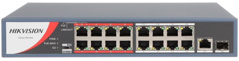 L2, Unmanaged, 16 10/100M RJ45 PoE ports, 1 Gigabit RJ45 uplink port, 1 Gigabit SFP uplink port, 802.3af/at, PoE power budget 130W, "Extend" Mode: ports 9-16 support up to 250meter, 6KV surgy protection,rack bracket inside