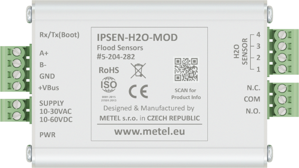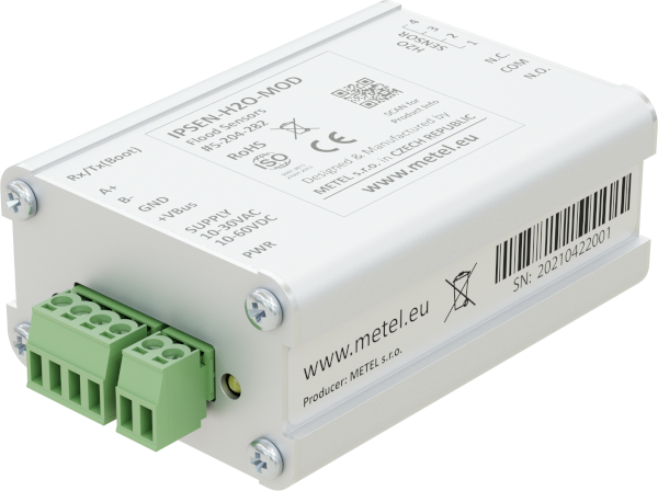 Vyhodnocovacia jednotka s: reléovým výstupom pre detekciu záplav, RS485 Modbus pre prenos alarmu na IPLOG. Maximálna dĺžka detekčného kábla 75m (10x MSC-750).