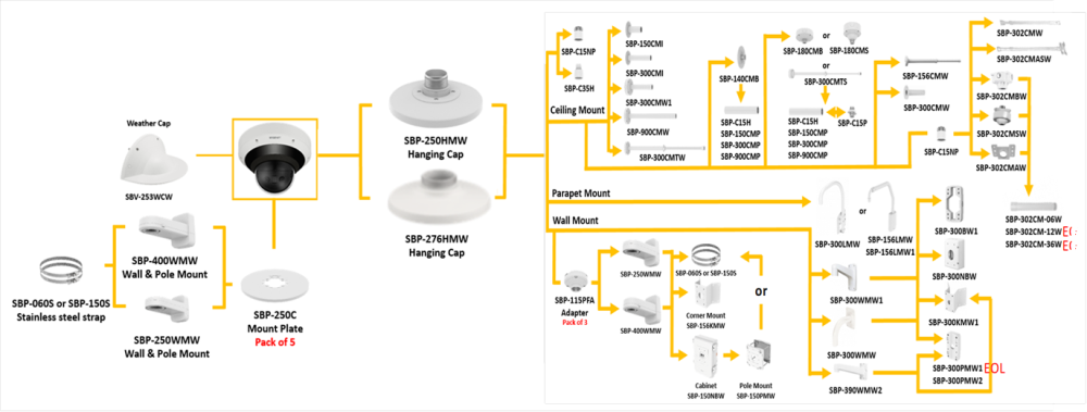 pevný držiak (pole mount) navrhnutý pre montáž SBP-150NBW kabinety (a iných príslušných montážnych riešení) na stožiare / stĺpy pri vonkajších inštaláciách kamerových systémov.
