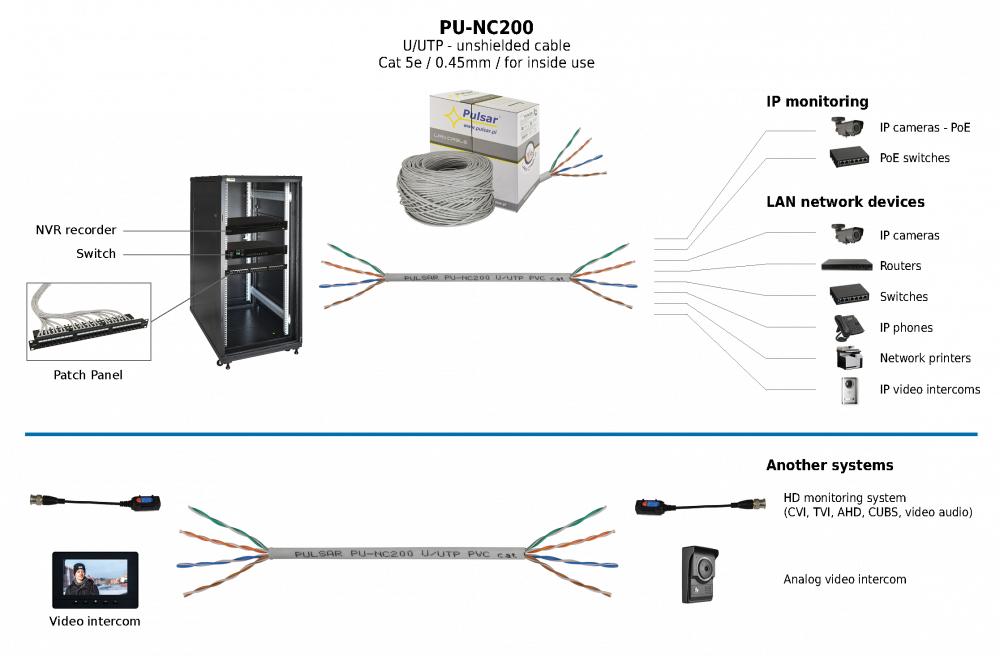 Použitie Kábel PU-NC200 je krútený pár U / UTP, kábel kategórie 5e. Môže byť použitý na prenos dát a prenos energie (PoE). Môže byť použitý v mnohých systémoch, t. J. V systémoch ICT, monitorovacích systémoch IP videa (obzvlášť odporúčané pre systémy IP PoE), ale bude dobre fungovať aj v digitálnych uzavretých televíznych systémoch HD (CVI, TVI, AHD). Kábel je určený na profesionálnu inštaláciu vo vnútri budov a zodpovedá norme PN-EN 50575 (CPR).