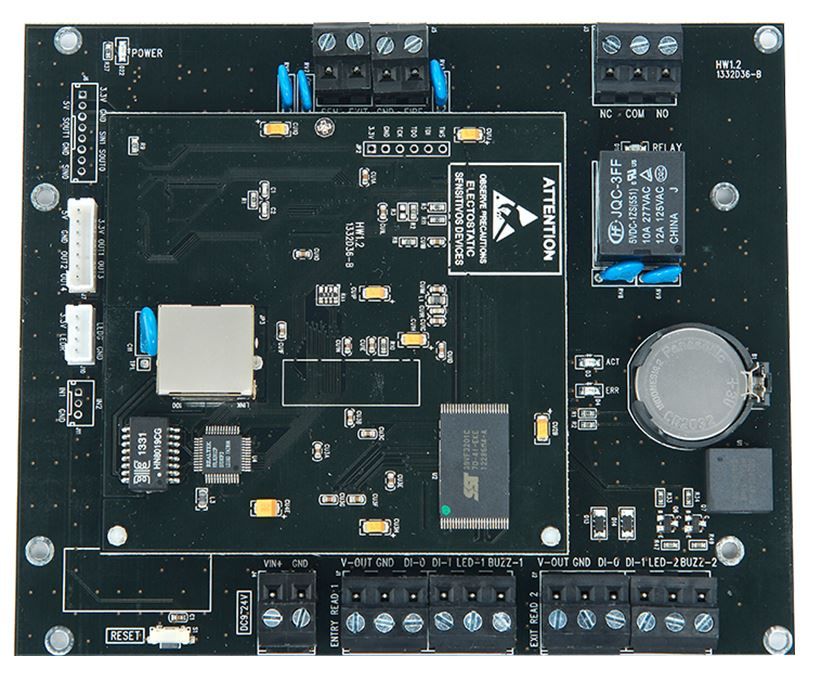 Modul na dva Wiegnd vstupy pre pripojenie RFID čítačky, odchodové tlačidlo, vstup pre monitoring dverí, jeden poplachový vstup a jedno NO/NC relé pre ovládanie zámku Rozmery PCB 138 x 114 x 27m