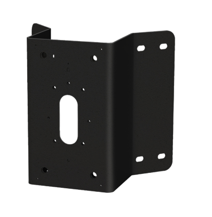 Robustná rohová montážna konzola (corner mount) v čiernom prevedení, určená pre bezpečné uchytenie IP kamier i-PRO na vonkajšie rohy budov.